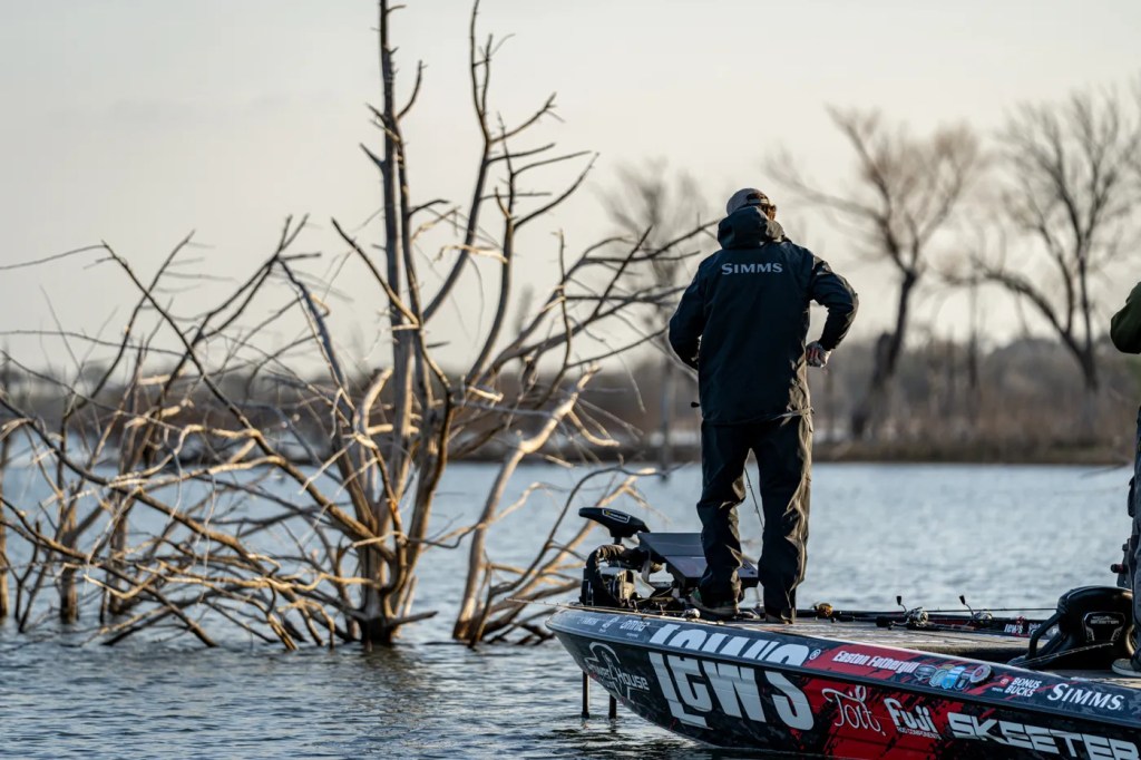 First, during days 1 and 2, anglers reported finding that colder air temperatures had pulled water temperatures several degrees lower than they’d found in practice. Also, John Garrett noted that the front’s strong winds had churned up colder main lake water and pushed it into the shallower creeks and pockets where bass were moving.