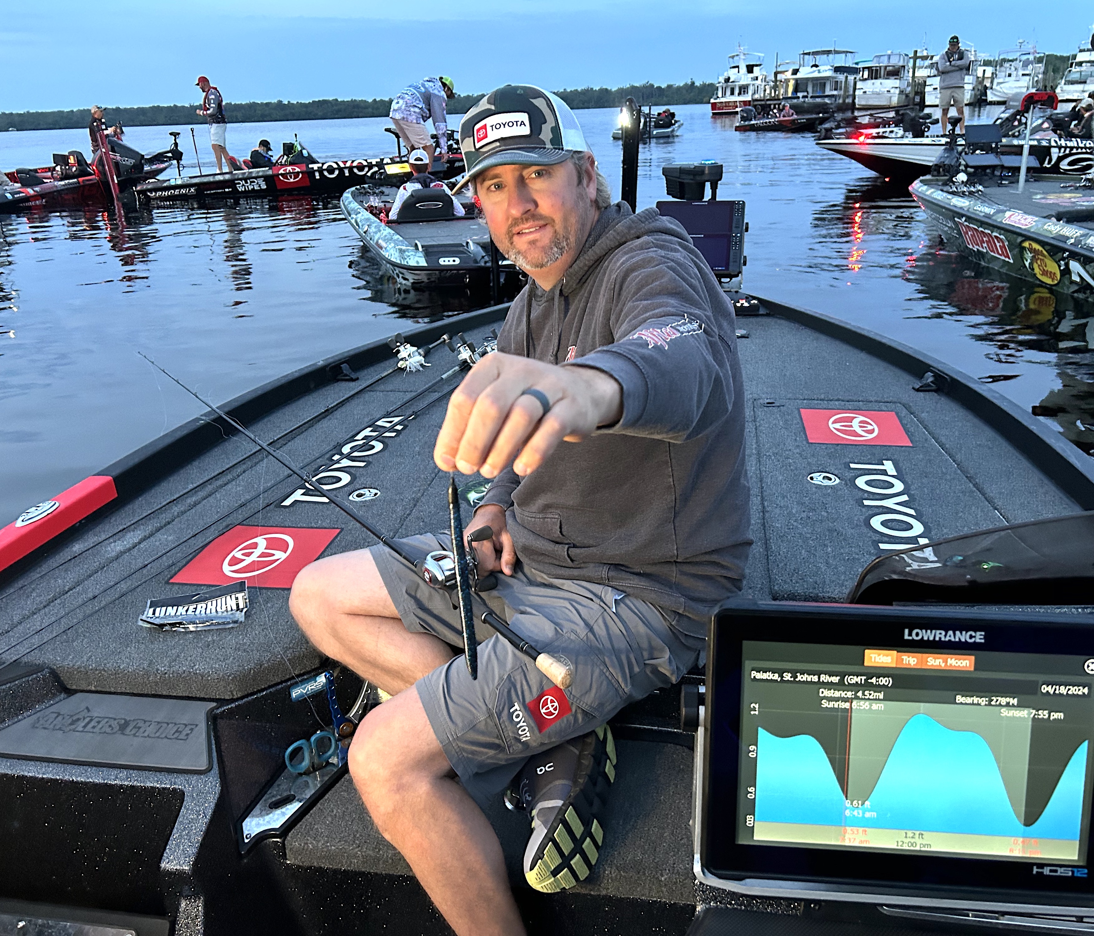 Team Toyota’s Matt Arey says he won’t allow the challenging tide-driven water level changes of the St. Johns River to dictate his day, but he did take time to look at tidal charts briefly on his Lowrance unit prior to Day 1 blast-off in Palatka.