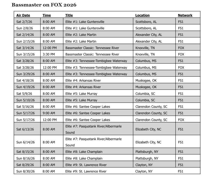 Anchoring the broadcast lineup is the Bassmaster Classic on the Tennessee River in Knoxville, Tenn. Fans can tune in March 14 at Noon ET and March 15 at 3:30 p.m. ET on FOX. “Bass fishing is at its most exciting when viewers can experience it in real time, and FOX brings our biggest stage into living rooms nationwide,” said B.A.S.S. Chief Operating Officer Phillip Johnson. “This schedule gives fans not only the Classic in front of a massive broadcast audience, but also Elite events where viewers will see the drama unfold live.”