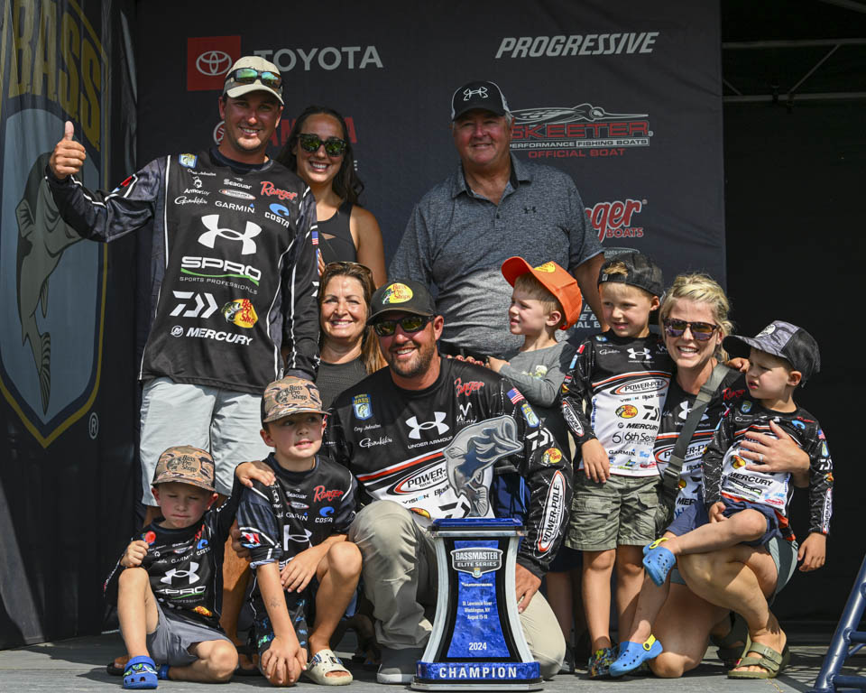 The Johnston families celebrate Chris’ AOY and Cory’s St. Lawrence Elite title, each garnering $100,000 to their joint bank account. Chris claimed $25,000 for fourth and $3,000 in bonuses and Cory added $30,000 for third in AOY, bringing their total to $258,000, about one-fifth of the purse. The brothers eclipsed Walters as each joined the Bassmaster millionaires’ club in fewer events, Chris in 65 and Cory in 66.