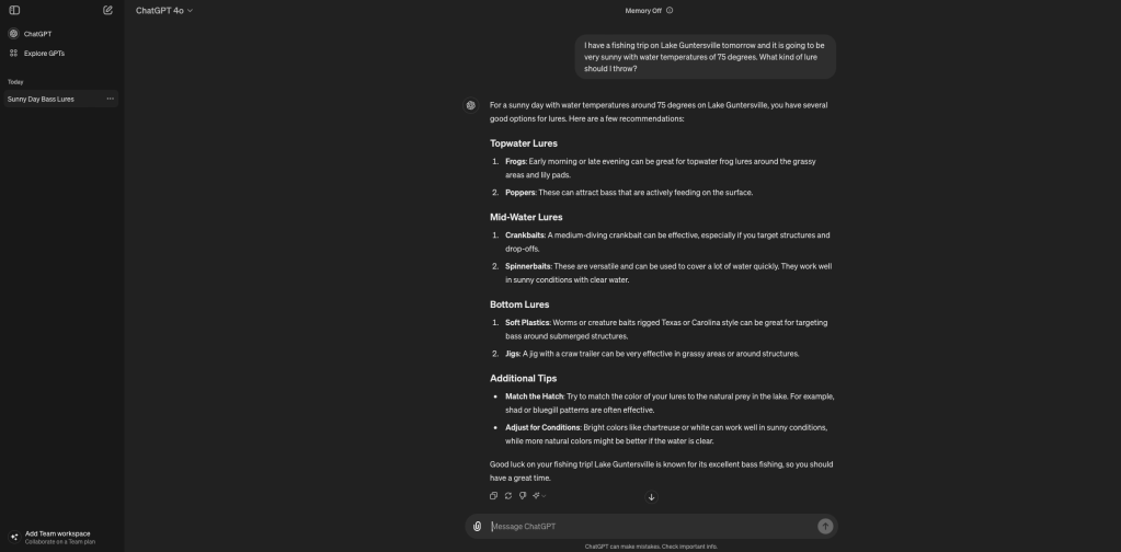 Chat GPT is a free AI tool available to the public that can provide fishing tips, answer questions, and offer personalized advice. It’s like having a fishing expert available 24/7 to assist you with any queries you might have. For example, you might be planning to fish at Lake Guntersville. You can go to Chat GPT and prompt a question like, “I have a fishing trip tomorrow on Guntersville and it is going to be very sunny with water temperatures of 75 degrees. What kind of lure should I throw?” At this point, Chat GPT will utilize one of the largest databases of articles, books, weather reports, and historical articles, such as those from Bassmaster, to come up with the most accurate answer. This is a great way to get a more specific answer, making it a valuable resource for both novice and experienced anglers.