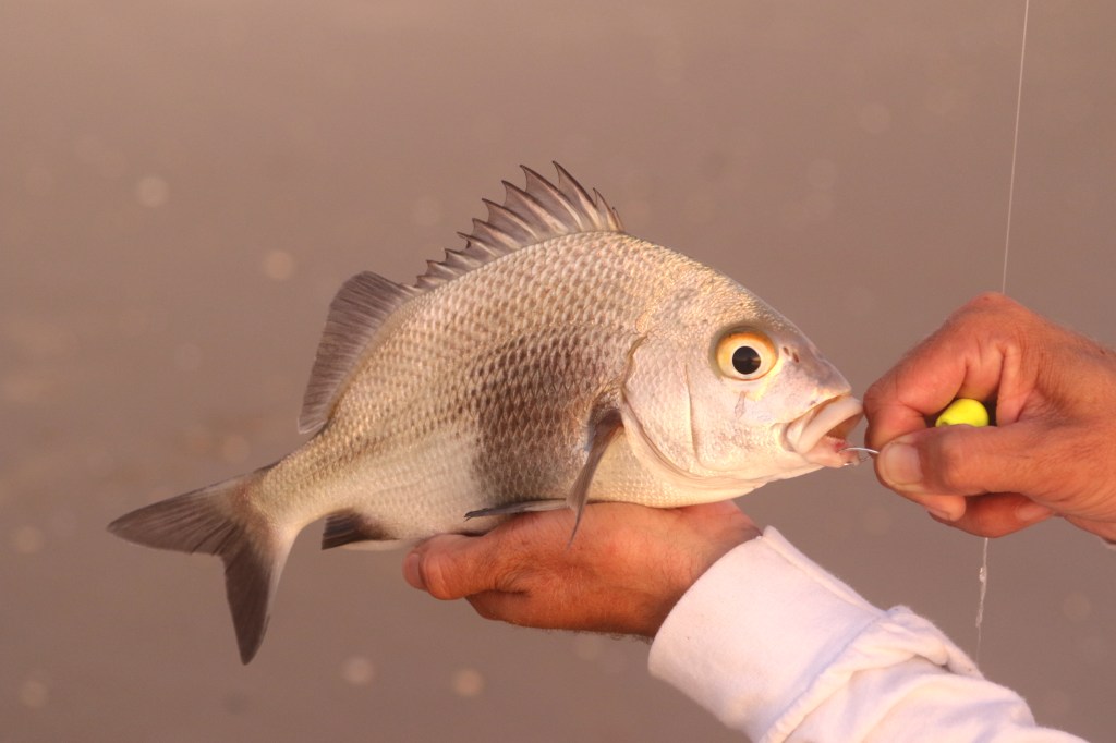 Baits also vary regionally and industrious types quickly learn to catch their own. (Another lesson for another day.) However, you can’t go wrong with shrimp, mole crabs (aka “sand fleas”) or Fish Bites — a durable synthetic bait made with real fish and crustacean scents/flavors.