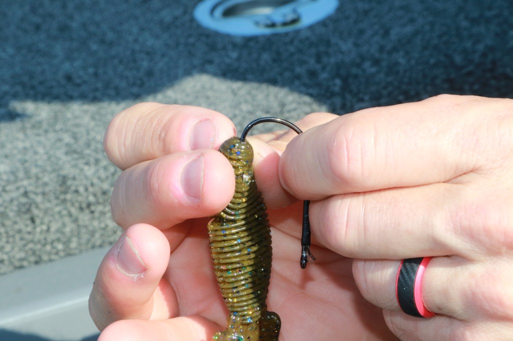 This ensures proper alignment by covering the hook’s neck — the straight section between the eye — and the outward flaring shank. Re-inserting the hook point into the bait’s body protects it from snagging for the classic weedless presentation.