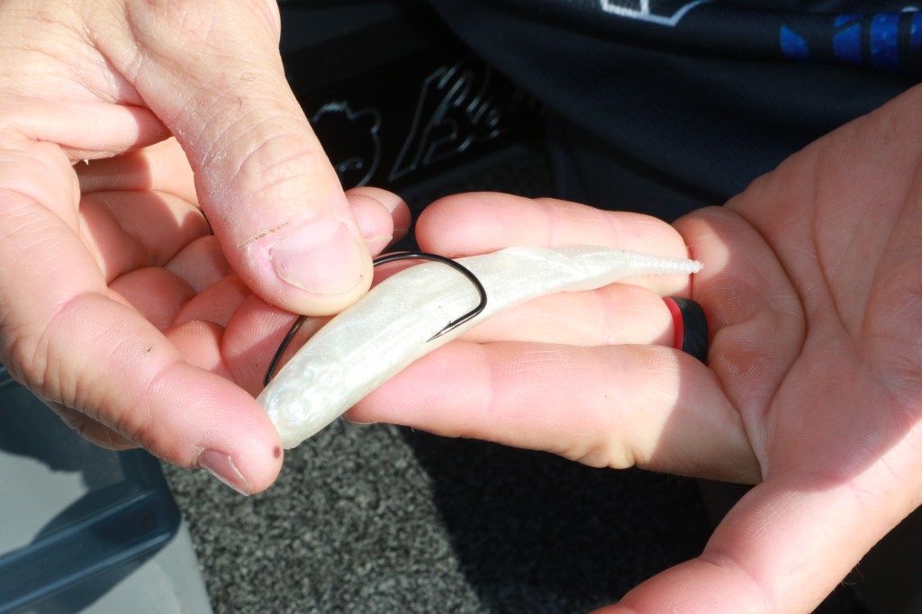 For clarity, a bait like the D-Bomb has an overall larger profile than a fluke style bait, but anglers typically rig creature baits laterally, through the thinnest section, whereas a fluke or a big worm positions the bait’s full mass in the hook gap. Too much plastic riding in the hook gap can limit hook-up efficiency, so using an EWG style minimizes that impediment.