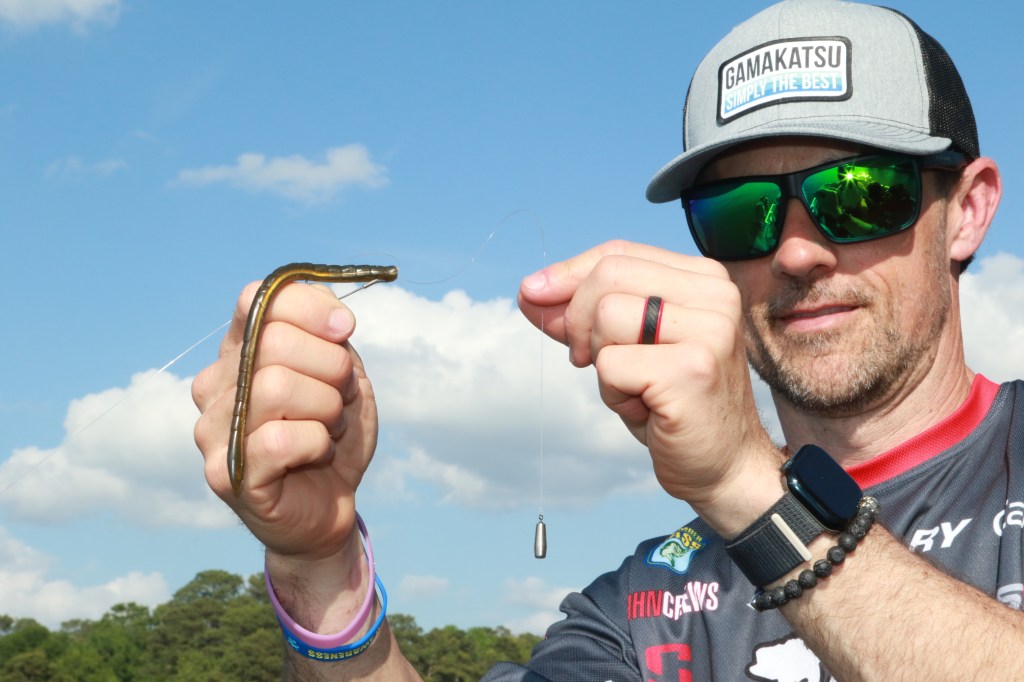 Before tying on the hook, Crews adds the appropriate size bullet weight to his line. As the hook name implies, he’s flipping or pitching his bait into dense habitat; anything from matted grass, to pads, to laydowns. The heavier the cover, the heavier the weight and with a “keeper” built into the hook, the bait stays in place as it moves in and out of cover.