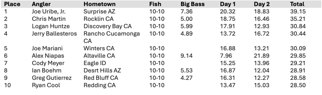 Day one pro leader Joe Uribe Jr. from Surprise, Ariz. and day two AAA David Undwerwood fished new water in the same area he had fished on day one and found the Lake Shasta spotted bass to be cooperative. Uribe managed to bring an 18.83-pound limit to push Uribe’s total weight to 39.15 pounds and retain the lead in the event.